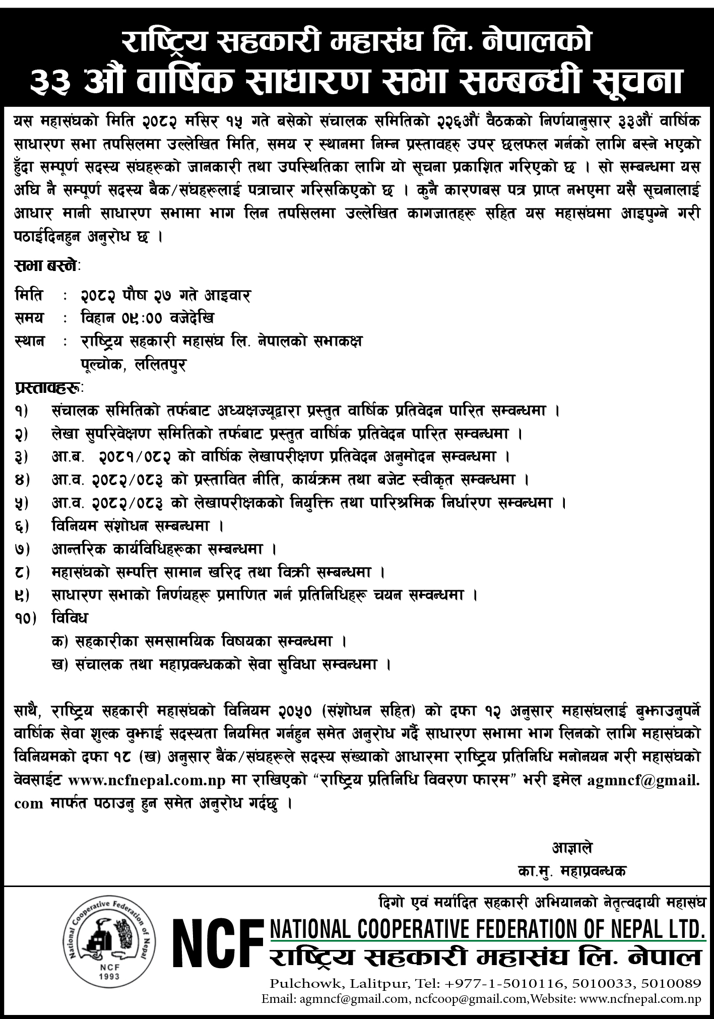 | 3. | ३३ औं वार्षिक साधारण सभा सम्बन्धी सूचना | Dec 11, 2025 | View | Download |